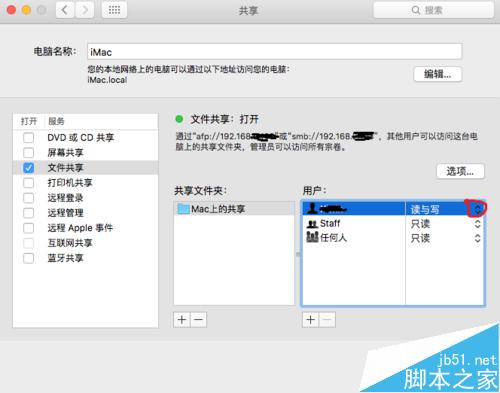 5、可以給每個添加到共享的文件夾指定可以訪問的賬號和讀寫方式。"可以訪問的賬號"指的是在Mac電腦中創(chuàng)建的用戶賬戶。