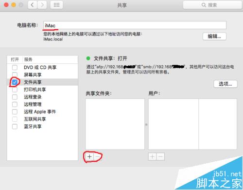 4、在共享設置中打開文件共享功能,然后點擊右側紅圈位置的+號,添加要共享的文件夾。