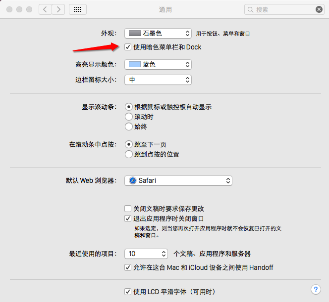第三步、在通用窗口,點擊勾選“外觀”選項下面的“使用暗色菜單和Dock”即可!一定要注意“外觀”里面有兩種選擇方式,建議選擇成石墨色