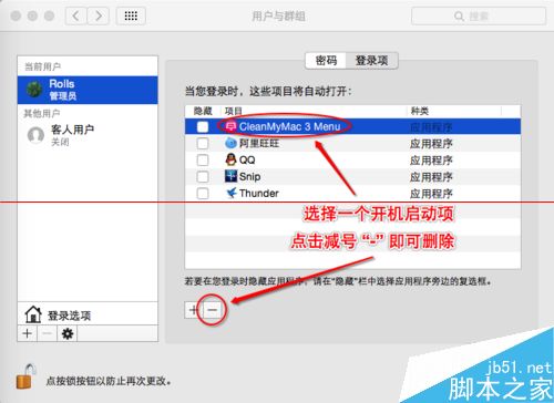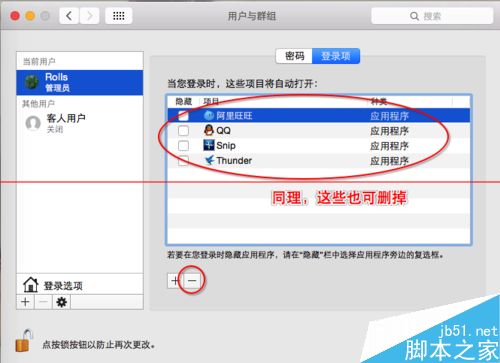 6、刪除第一個(gè)后,同理,下面的都可以點(diǎn)擊減號(hào)“-”刪除。相反,點(diǎn)擊加號(hào)“+”也可以添加某應(yīng)用程序作為開(kāi)機(jī)啟動(dòng)項(xiàng)。
