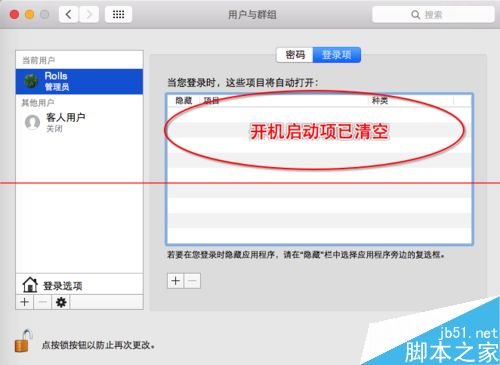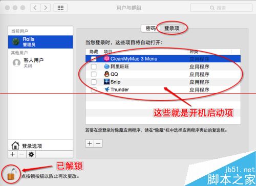 3、點(diǎn)擊左下角黃色的鎖,輸入電腦密碼解鎖。點(diǎn)擊上方的“登陸項(xiàng)”選項(xiàng)卡;