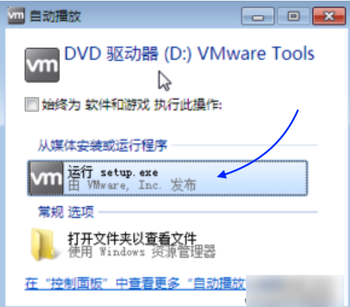 3、隨后請耐心等待一下,一般會在 Windows 系統(tǒng)中自動彈出安裝 Vmware Tools 的提示。點擊“運行 Setup.exe”選項即可。
