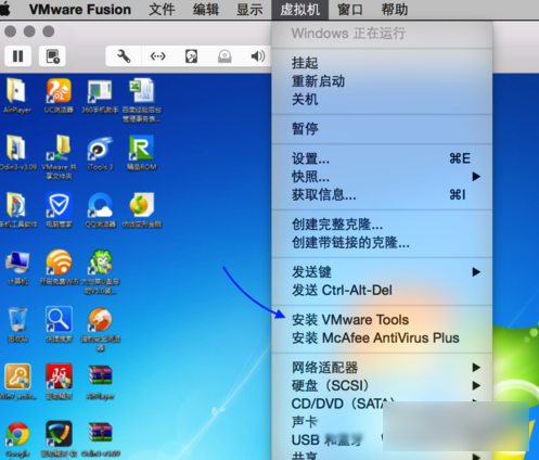 1、首先請在 Mac 上打開 Vmware 虛擬機,并運行 Windows 系統(tǒng)。等待進入 Windows 系統(tǒng)以后,請點擊頂部菜單欄中“虛擬機”下的“安裝 Vmware Tools”選項,如圖所示
