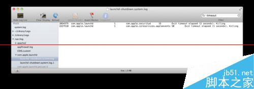 如何找到哪個服務進程退出延遲了呢?這就要看日志了,打開Console程序,在左邊找到/var/log >> com.apple.launchd >> launchd-shutdown.system.log,之后,在右上角的查找中,輸入timeout,就會出現如下圖的畫面,改圖這是我修改之后的截圖,在修改之前,兩個服務的timeout時間, applevents是20 seconds, securityd是15秒。
