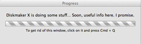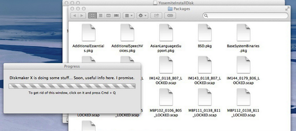 第八步:剩下的就是漫長的等到時間了,DiskMaker X 會自動開始 Yosemite 安裝 U 盤創建過程。創建時間與文件拷貝至 U 盤的速度有關系。只要耐心等待,可以看到DiskMaker X 后面會出現窗口并自動復制文件。