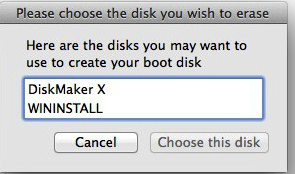 第五步:隨后DiskMaker X 會列出所有連接至 Mac 的驅動器,選擇后自己插入的 U 盤即可。注意不要選錯,DiskMaker X 會格式化 U 盤的。