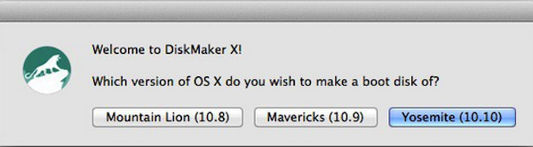 第二步:雙擊啟動 DiskMaker X ,第一個界面,軟件會詢問需要制作哪款系統的安裝 U 盤,目前支持10.8、10.9和10.10,選擇 Yosemite (10.10即可)。