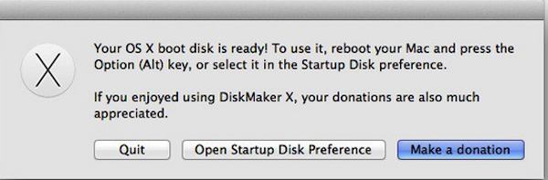 完畢后,DiskMaker X 會彈出提示,這時我們可以重啟 Mac 并按住 Option 按鈕,并選擇剛剛制作完成的 Yosemite 安裝 U 盤。
