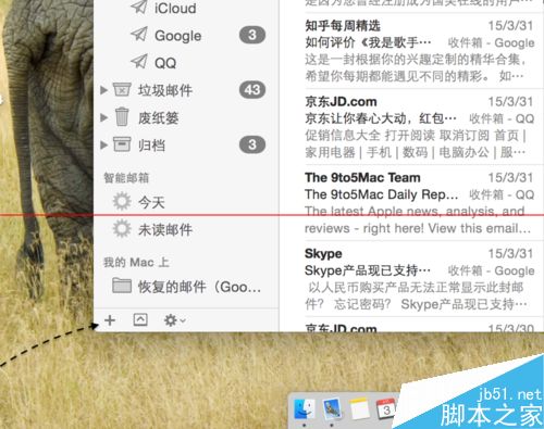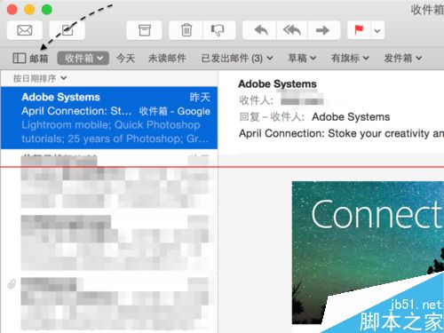 1、在 Mac 上打開郵件應(yīng)用以后,請先點擊窗口左上角的“郵箱”選項,如圖所示