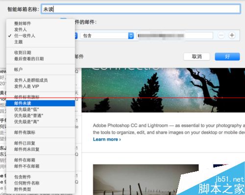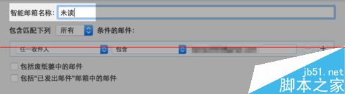 4、隨后會彈出小窗口,用以設(shè)置智能郵箱。比如在這里我打算創(chuàng)建一個名為“未讀”的智能郵箱,到時候可以直接點擊這個“未讀”郵箱查看所有的未讀郵件。