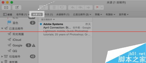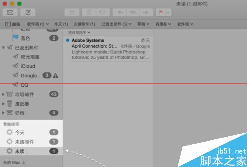 7、隨后在郵箱列表的“智能郵箱”下方,可以看到我們剛剛創(chuàng)建的“未讀”郵箱了。點擊它以后就可以看到當前郵件中所有的未讀郵件,是不是很方便。