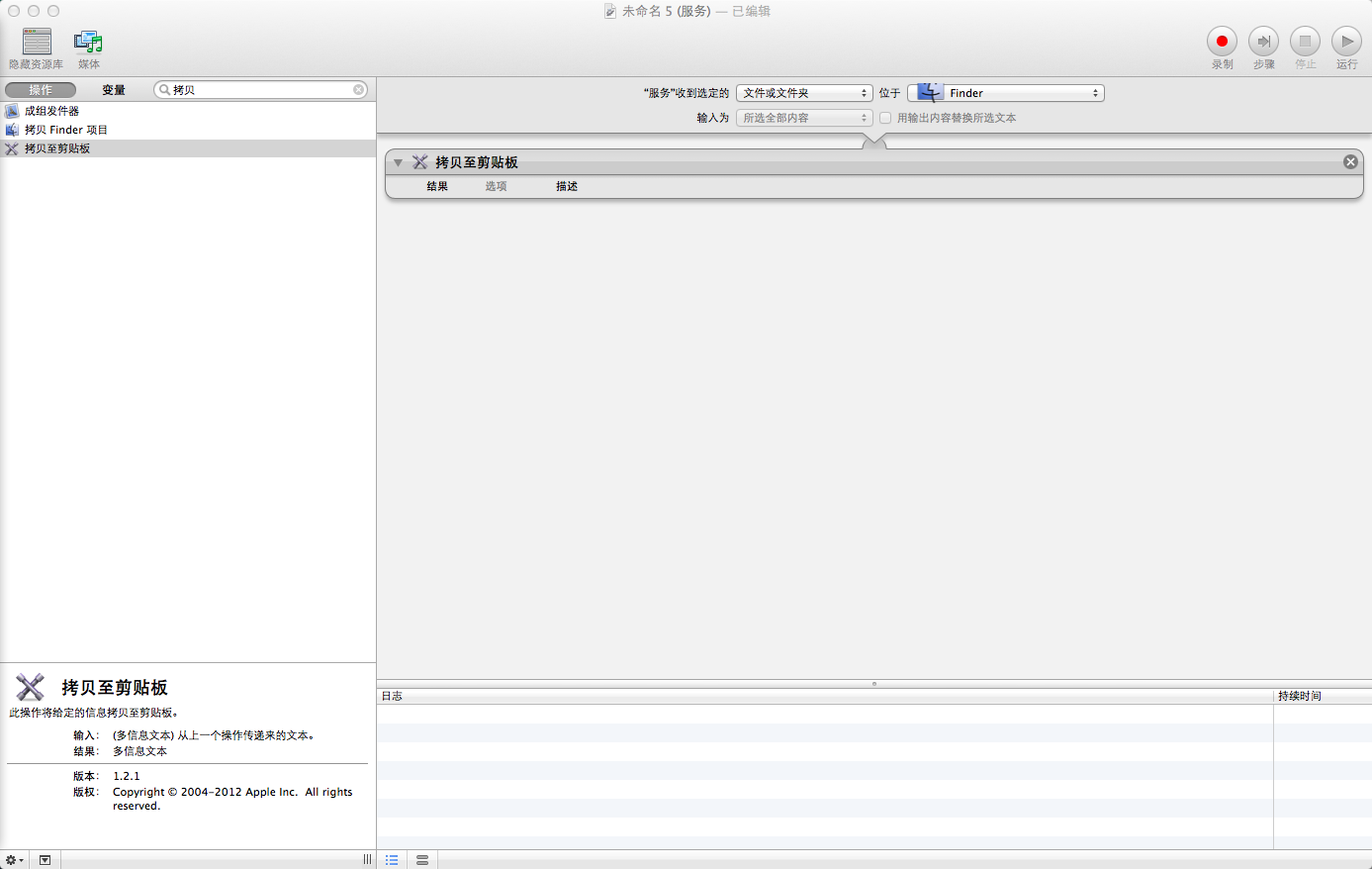 有兩個(gè)地方需要修改,“服務(wù)”收到選定為文件或文件夾,位于Finder,cmd+s保存,命名為Copy path,完事兒!