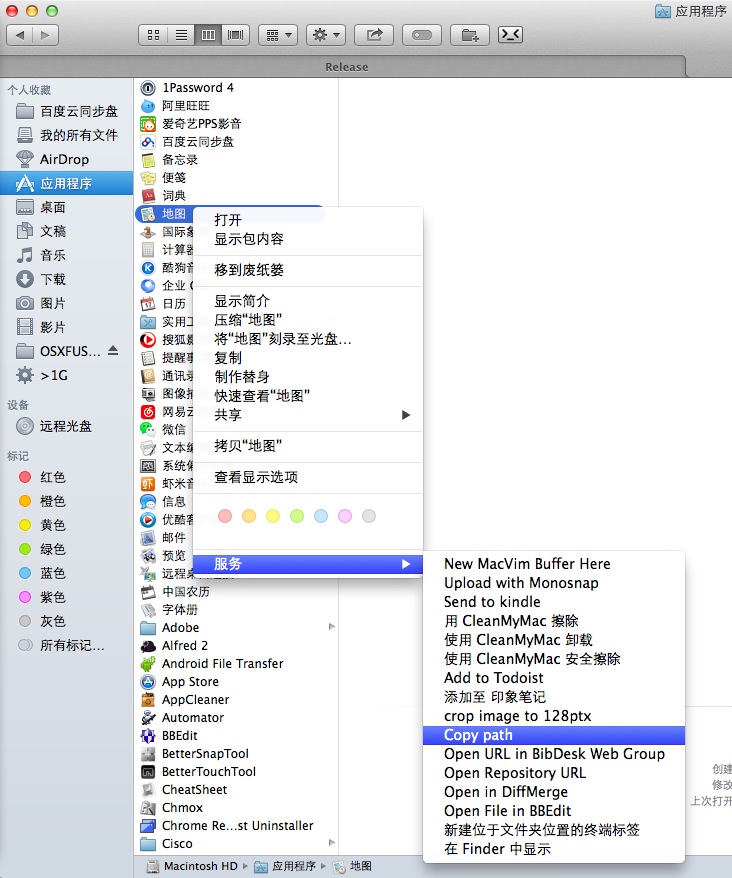 怎么使用呢?在Finder上隨便找一個(gè)文件,鼠標(biāo)點(diǎn)擊右鍵,看看服務(wù)選項(xiàng)里是不是出現(xiàn)了Copy path選項(xiàng),如下