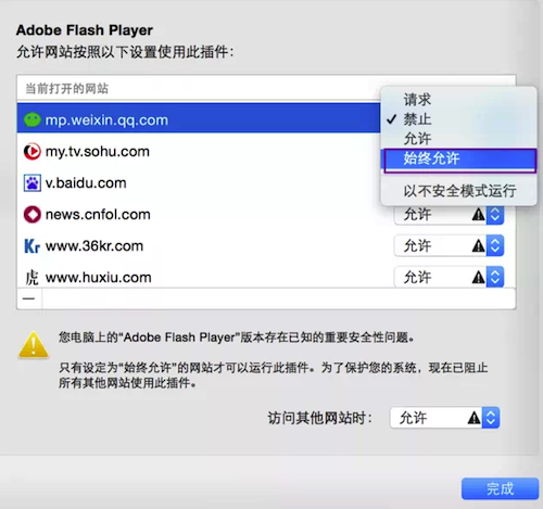 這也就意味著,用戶無法通過Safari觀看Flash內容。用戶在使用Safari瀏覽器訪問Flash內容的時候,會看到插件已攔截、Flash安全警告、Flash過期等提示信息。當然很多用戶也確實需要使用flash插件,比如微信公眾平臺上傳圖片,看優酷等等,下載其他瀏覽器可以使用,但是我習慣safari,其實簡單設置下還是可以使用的。蘋果還會要求用戶下載新版本的Flash Player,但事實上,Adobe并未發布任何更新,所以用戶要么放棄觀看Flash,要么冒著安全風險進行。