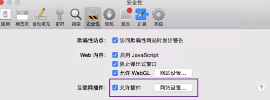 3,找到安全性菜單下的互聯網插件,允許插件默認都是打勾的,點擊打開網站設置。