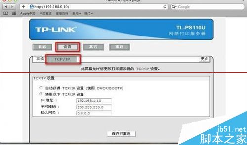 5、第三步 打開系統瀏覽器Safari,輸入http://192.168.0.10回車進入打印服務器的管理界面,選擇設置--TCP/IP,修改打印服務器的IP地址后點擊保存并重啟。
