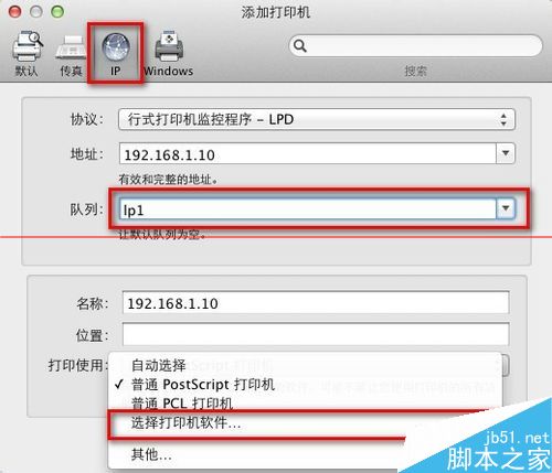 10、協議:行式打印機監控程序-LPD。地址:打印服務器的IP地址。隊列:lp1。打印使用:通過選擇打印機軟件選項來選擇您打印機所對應的驅動后點擊好按鈕。