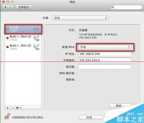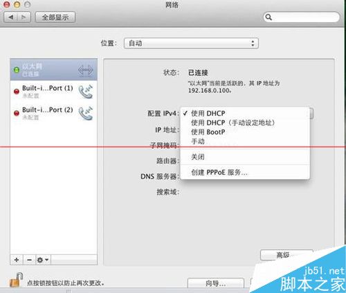 6、第四步 將打印服務器按照預訂的使用拓撲與打印機和路由器連接好,將您的MAC電腦的IP地址改回之前的數值,例如配置IPv4改為使用DHCP或者手動指定為原來的IP地址。