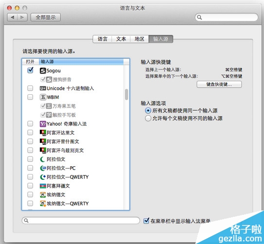 點擊桌面左上角蘋果圖標打開菜單,點擊系統偏好設置,在系統偏好設置窗口點擊“語言與文本-輸入源”,在左側列表找到Sogou-搜狗拼音,打鉤選中(可以在底部輸入框輸入sogou快速查找),同時選中“在菜單欄中顯示輸入法菜單”,可以設置“鍵盤快捷鍵”為cmd+space選擇上一個輸入源
