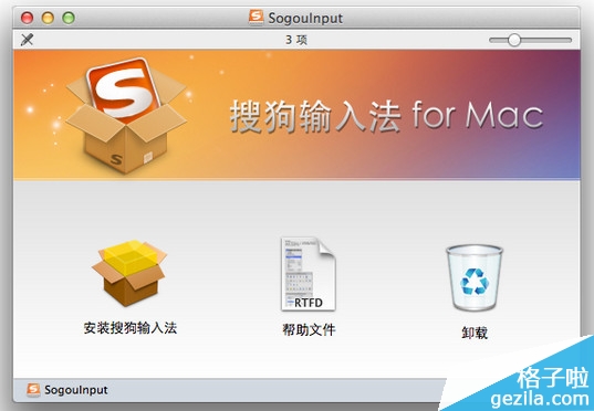 雙擊搜狗輸入法 for Mac 安裝包(sogou_mac_xxx.dmg),在打開的窗口中有三個圖標:安裝搜狗輸入法、幫助文件、卸載
