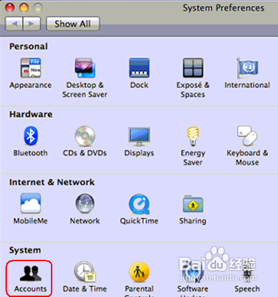 1、蘋果圖標打開“系統偏好(System Preferences)”,點擊“系統(system)”中的“帳戶(Accounts)”: