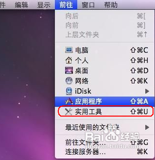 2、在Finder欄中,點擊“前往(GO)”,選擇“實用工具”,再雙擊打開“終端”: