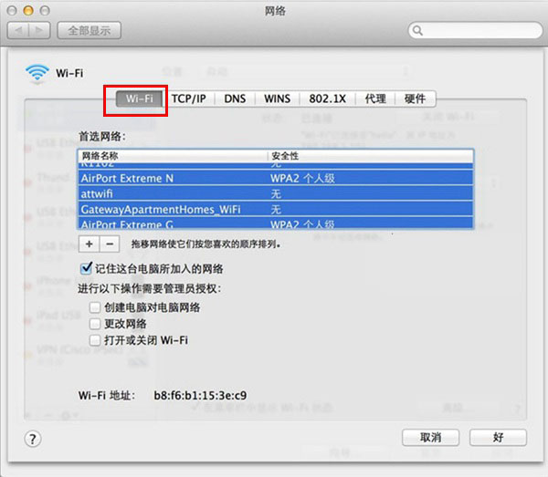 4、點(diǎn)擊“首選網(wǎng)絡(luò)”,按Command-A全選,然后點(diǎn)擊“delete”刪除所有的備選連接
