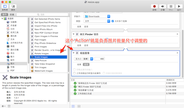 最關鍵的一步就是到「資源庫」- 「照片」里找到「Scale Images」拖入右側最后的位置,我們在「縮放圖像」里選擇「至大?。ㄏ袼兀梗钊肽J的像素值。