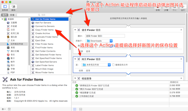 到了編輯界面,我們可以在「資源庫」- 「文件和文件夾」里找到「Ask for Finder Items」和「Copy Finder Items」這兩個 Action 拖入到右側空白區域,在「請求 Finder 項目」里我們要提前設定好默認的圖片存放目錄,這樣每次打開 APP 都會自動定位在這個目錄里挑選圖片,我們可以配合 Hazel 對各類圖片進行管理,這樣會方便許多。