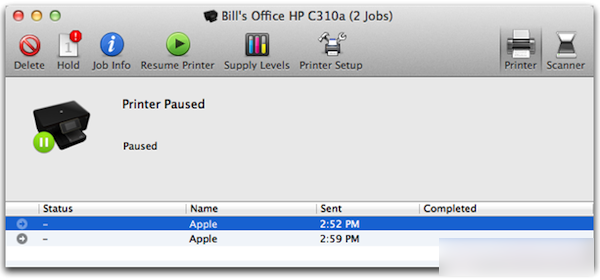 您也可從“系統(tǒng)偏好設(shè)置”的“打印與掃描”面板中打開打印隊(duì)列。以下是打印隊(duì)列示例: