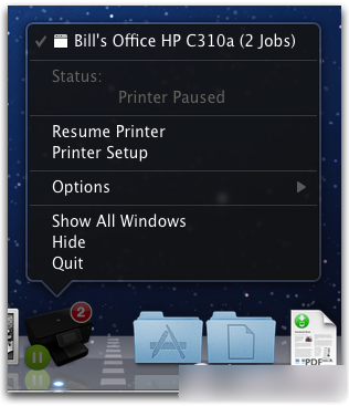 按住 Control 鍵的同時(shí)點(diǎn)按該圖標(biāo)將顯示打印機(jī)隊(duì)列的 Dock 菜單,如圖所示。