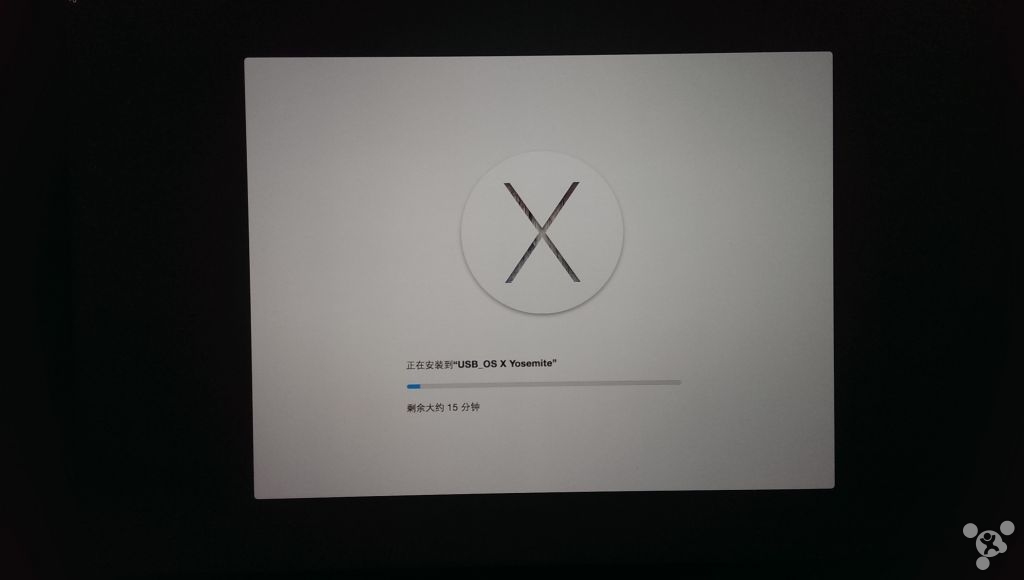 3、第一次自動重啟后,黑屏白蘋果白色進度條,需要等待一段時間,到這里,過程就跟直接雙擊Install OS X Yosemite.app安裝一樣了: