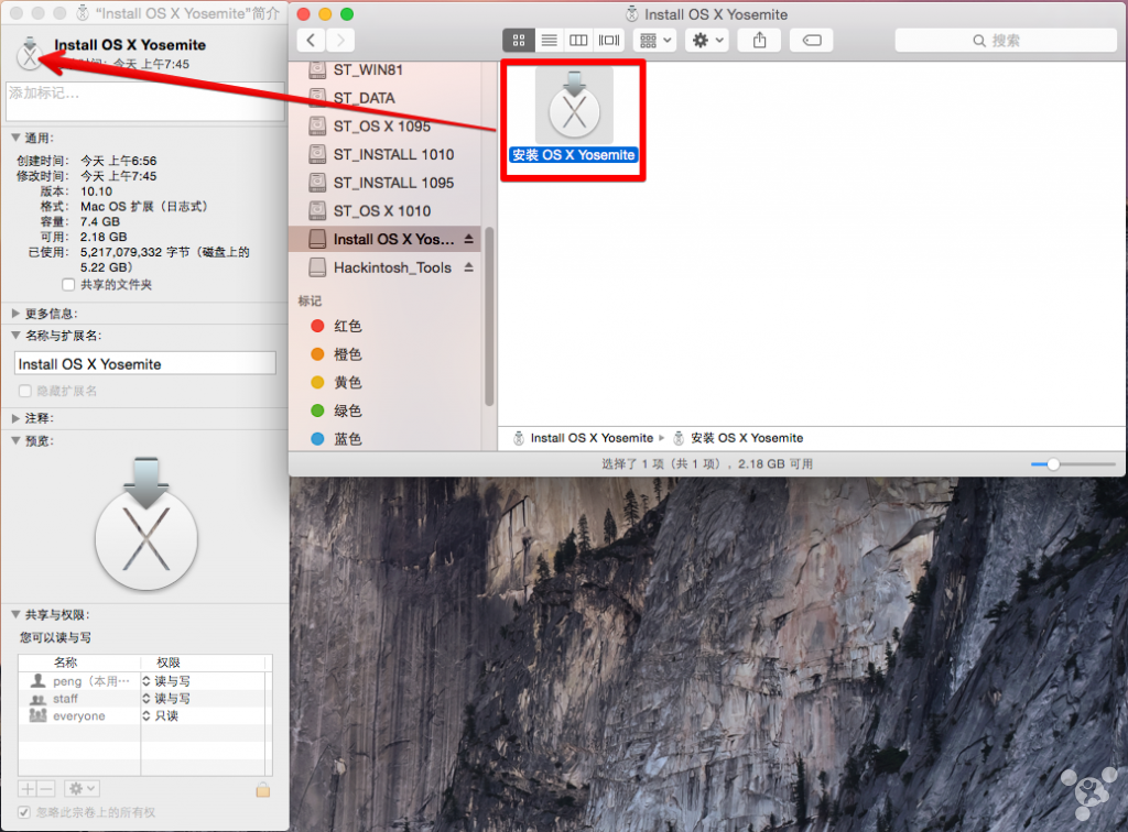 安裝U盤制作完成后,雙擊打開桌面上的Install OS X Yosemite 安裝U盤,再用右鍵點擊桌面上的Install OS X Yosemite 安裝U盤,點擊“顯示簡介”,把安裝U盤中的文件圖標拖到簡介信息上部的小圖標上: