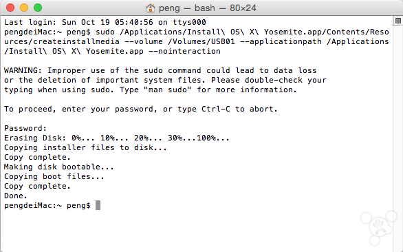 通過”終端”命令制作安裝盤:打開 "終端", 在命令行中執行下面的命令,當提示輸入密碼時請輸入你的 OS X 管理員登陸密碼。