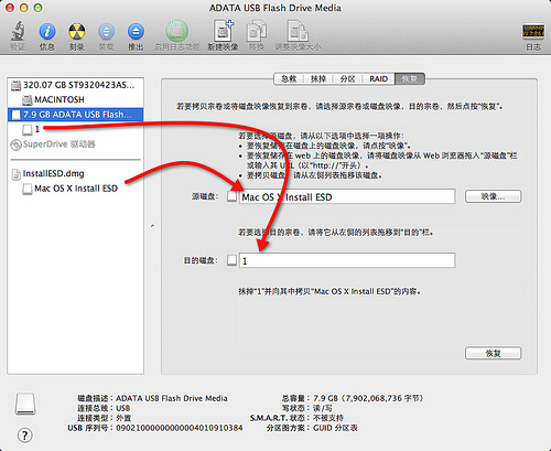 U盤格式化完成后選擇“恢復”選項。將剛才格式化好的U盤“1”拖拽到目的磁盤右邊的欄目中,在將“Mac OS X Install ESD”拖拽到源磁盤右邊的欄目中,單擊“恢復”。