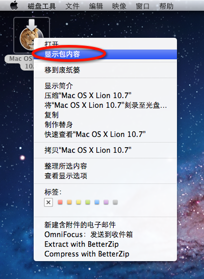 右鍵單擊Mac OS X Lion 10.7,選擇“顯示包內容”。