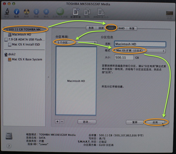選擇需要安裝系統的硬盤,默認選擇第一塊硬盤,單擊“分區”,分區布局推薦選擇“1個分區”,名稱無所謂,格式選擇“Mac OS 擴展(日志式)”,單擊“應用”。