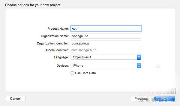 為我們的項目輸入一個名稱,我叫自己的應用命名為Auth。接下來輸入組織名稱、公司標識以及類前綴。在Devices列表中選擇iPhone,然后點擊Next,接下來為項目選擇一個文件保存位置。