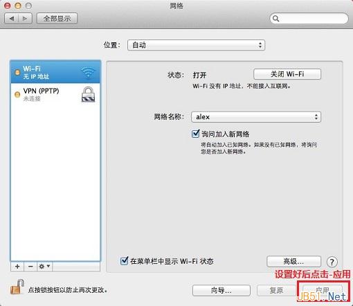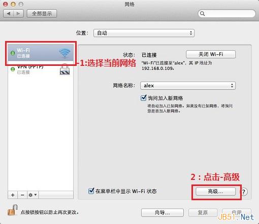 第三步:選擇當前使用的網絡連接,教程當前網絡為WIFI,大家設置時請選擇自己當前的網絡連接(WIFI或者本地連接),選擇后點擊-高級按鈕(如圖)