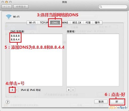 第四步:首先選擇當前網絡-DNS,然后單擊+號添加DNS,單擊兩次+號后添加DNS為8.8.8.8和8.8.4.4 最后添加完成點擊-好(如圖)