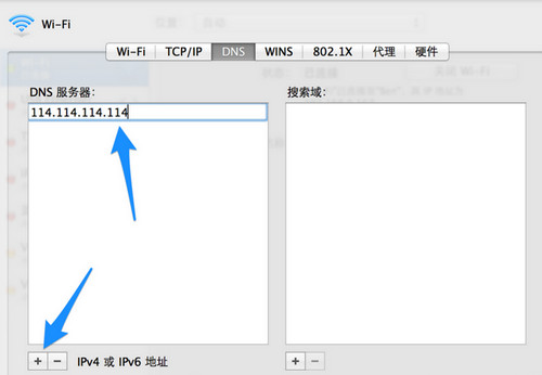 第五步:在 DNS 設置窗口中點擊左下方的 + 按鈕,輸入一個新的 DNS 地址 114.114.114.114,如圖所示。