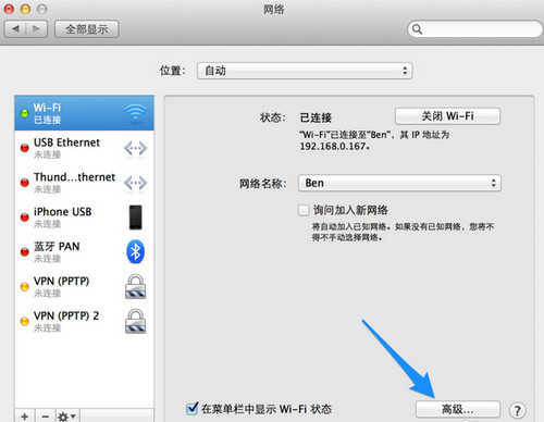 第三步:在網絡設置窗口中,點擊窗口中的“高級”按鈕,如圖所示。