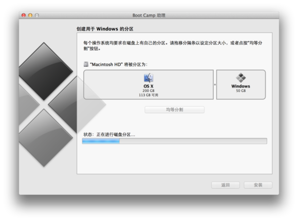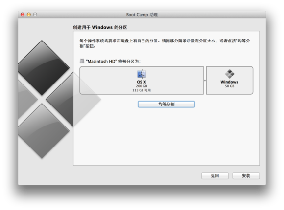 9、安裝盤制作完成后我們就來到了分區界面。拖動中間的小圓點來調節OS X與Windows分區的大小,或直接點擊均等分割來平分兩個分區。