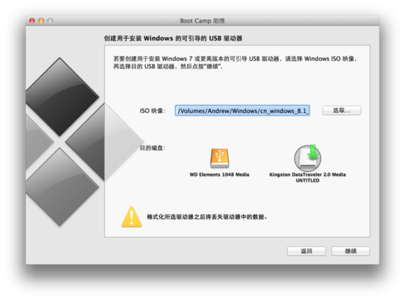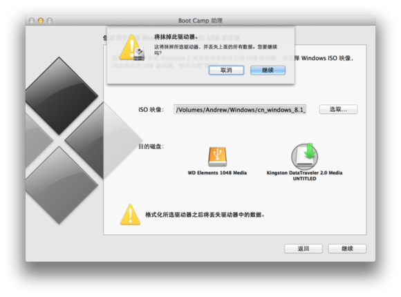 6、在下方選擇你的U盤。如果你同時插著其他的USB驅動器(如:移動硬盤),此處一定小心選擇,否則稍后移動硬盤被格式化掉就得不償失了。選擇好后點擊繼續。