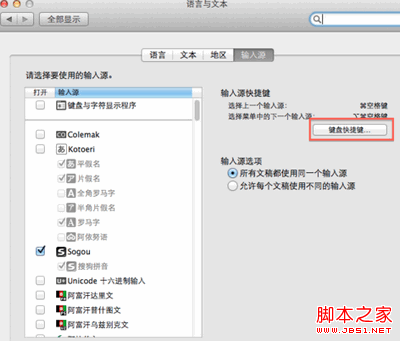 三.在打開的"語言與文本對話框中,選擇輸入源選項卡,點擊右側的鍵盤快捷鍵設置