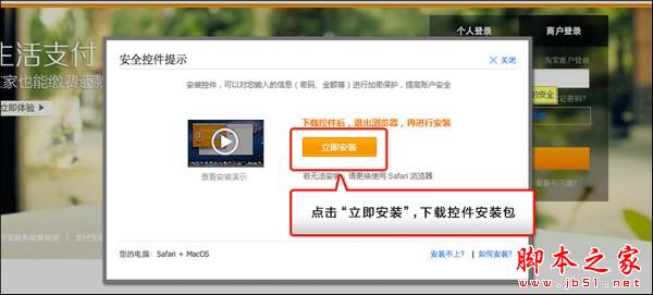 1、以Safari瀏覽器為例:打開支付寶首頁www.alipay.com,點擊【請點此安裝控件】;