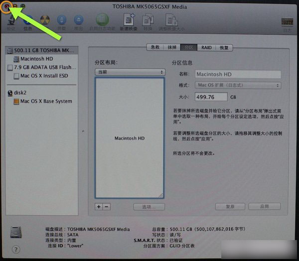 分區結束后單擊屏幕左上角的紅叉,關閉磁盤工具。