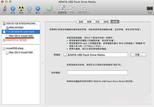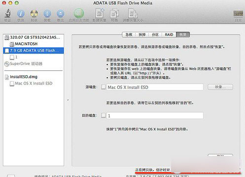 U盤格式化完成后選擇“恢復”選項。將剛才格式化好的U盤“1”拖拽到目的磁盤右邊的欄目中,在將“Mac OS X Install ESD”拖拽到源磁盤右邊的欄目中,單擊“恢復”。