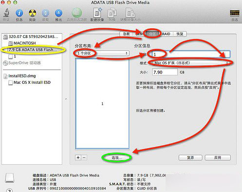 插入U盤(至少8G容量)。單擊U盤名稱,選擇“分區”,在分區布局選項中選擇“1個分區”,名稱建議使用數字“1”,格式選擇“Mac OS 擴展(日志式)”,之后進入“選項”。