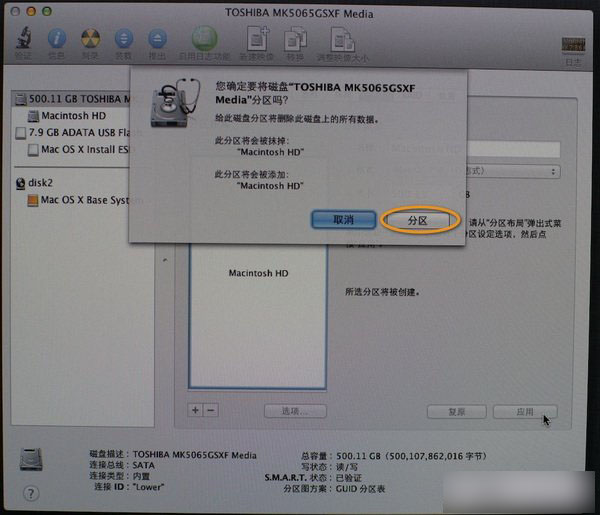 選擇需要安裝系統的硬盤,默認選擇第一塊硬盤,單擊“分區”,分區布局推薦選擇“1個分區”,名稱無所謂,格式選擇“Mac OS 擴展(日志式)”,單擊“應用”。